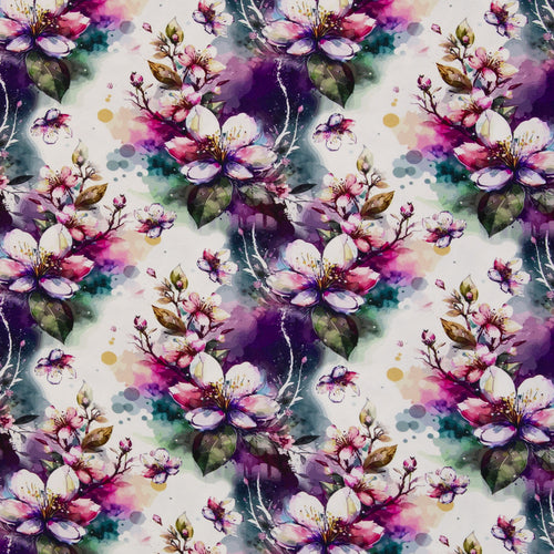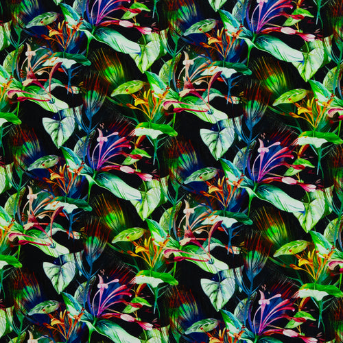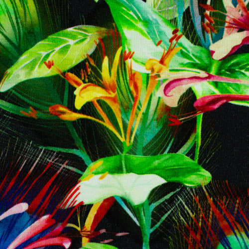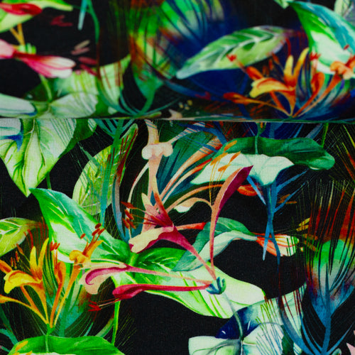 Außerdem gibt es ein exotisches, tropisches Muster mit bunten Pflanzen und Schmetterlingen auf dunklem Hintergrund – ideal für lebendige Sommermode mit Urlaubsflair.