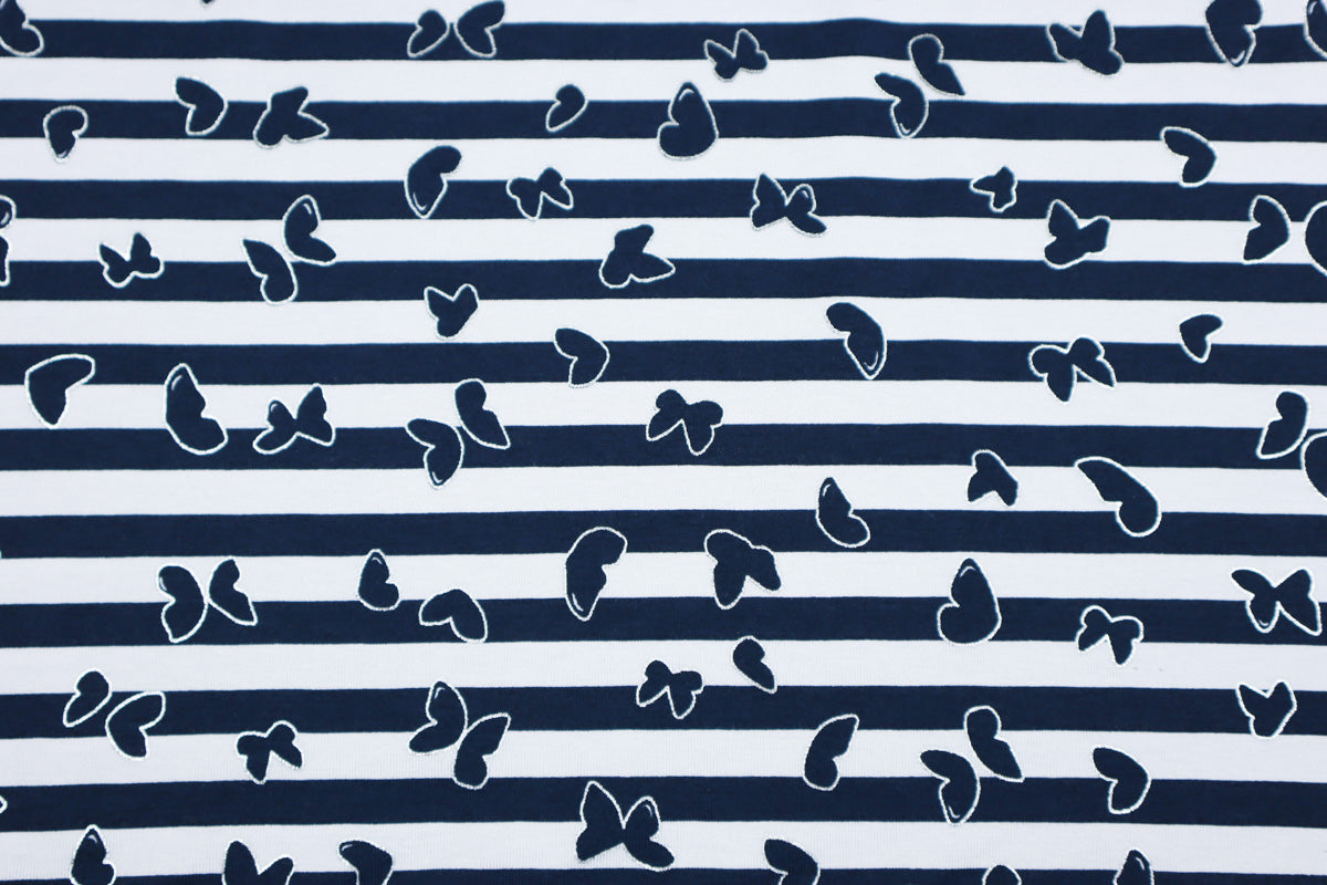 Schönes Muster mit silber umrandeten Schmetterlingen auf dunkelblau/weiß gestreiftem Hintergrund.