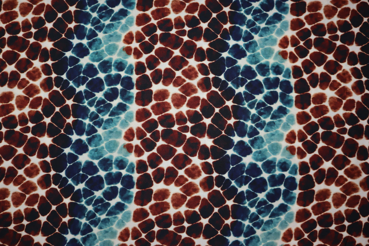Verpass deiner Garderobe einen edlen Look mit diesem hochwertigen Viskose Stoff mit Flecken in farbigen Streifen.