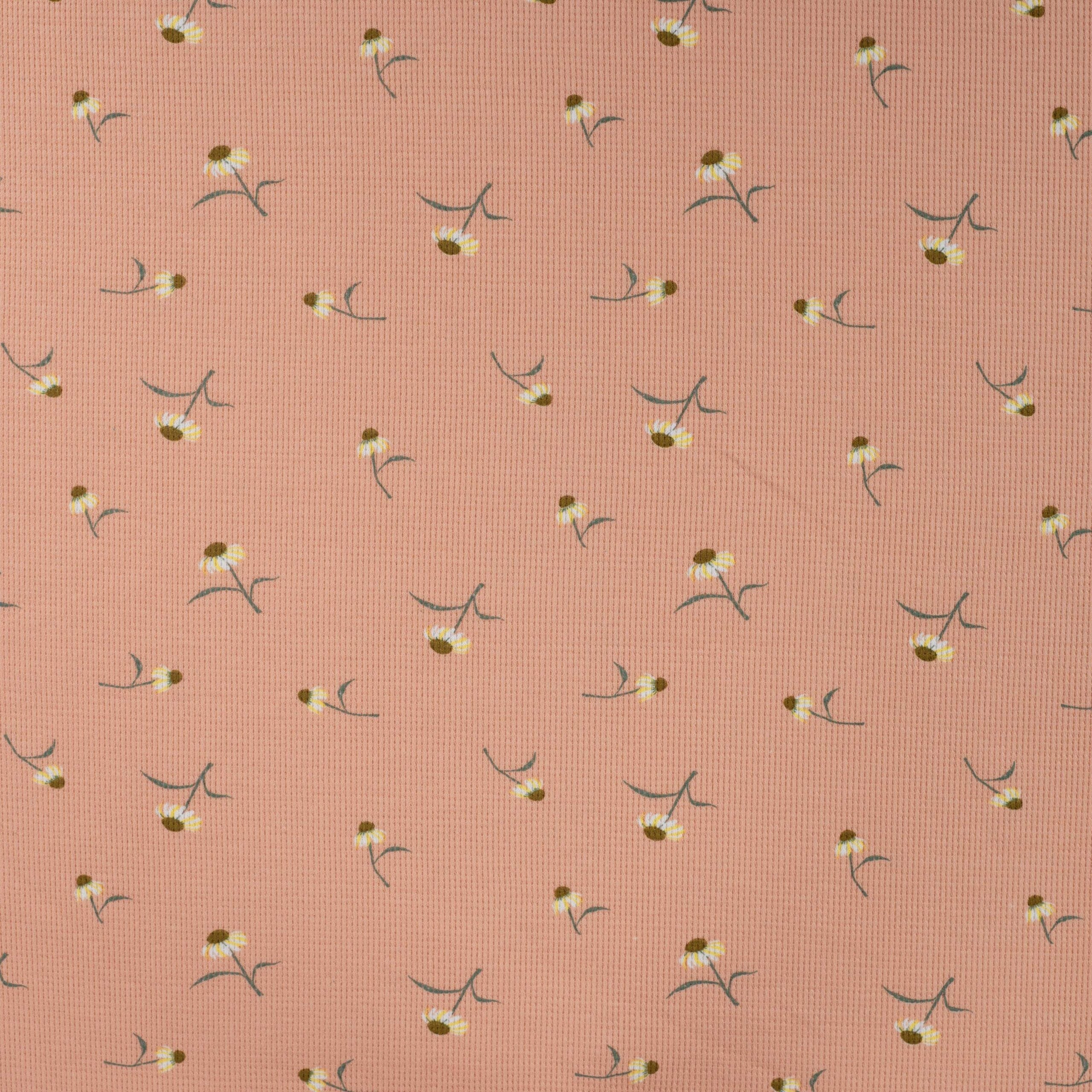 Waffeljersey mit kleinen Gänseblümchen auf lachsfarbenem Hintergrund.