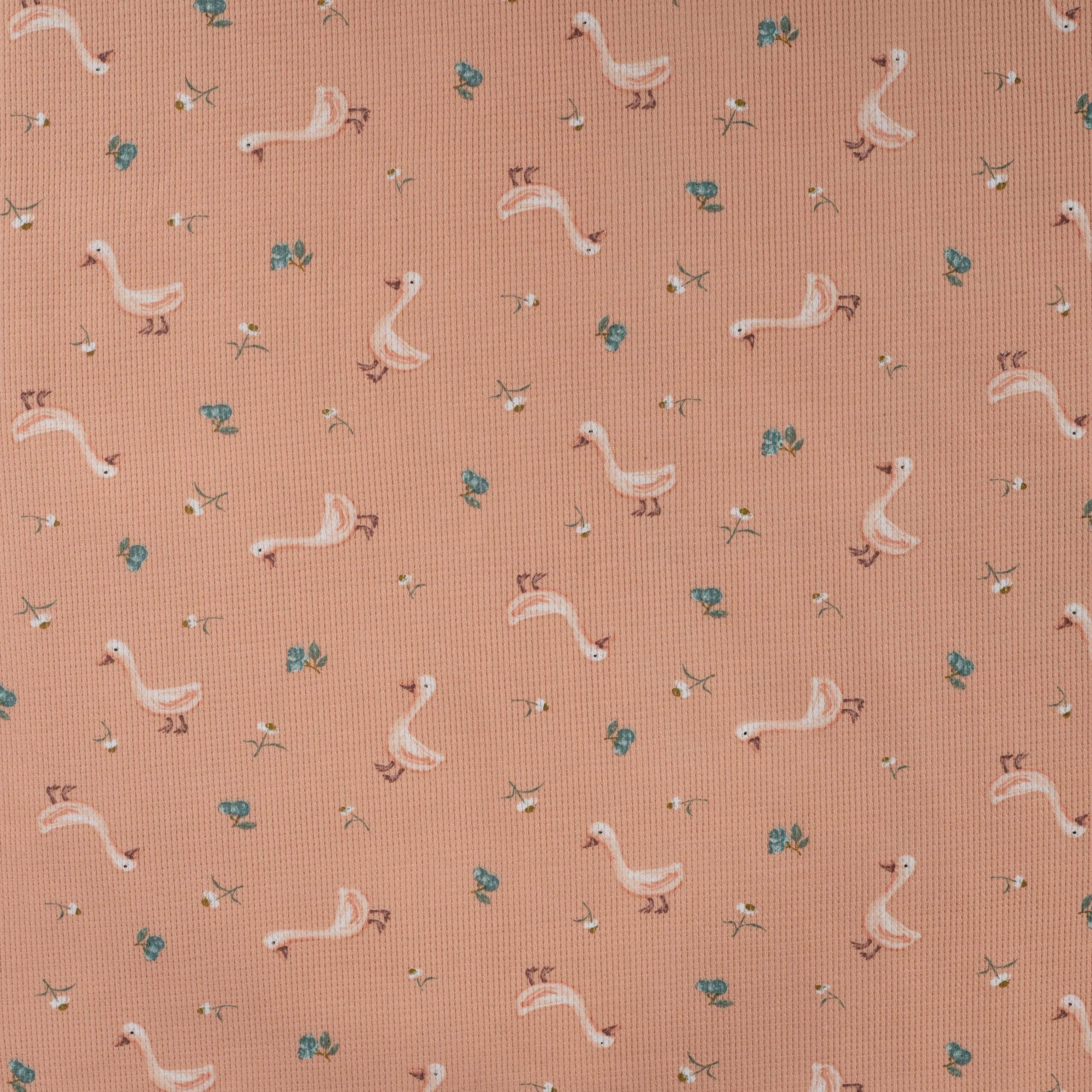 Waffeljersey mit kleinen Gänsen auf lachsfarbenem Hintergrund.