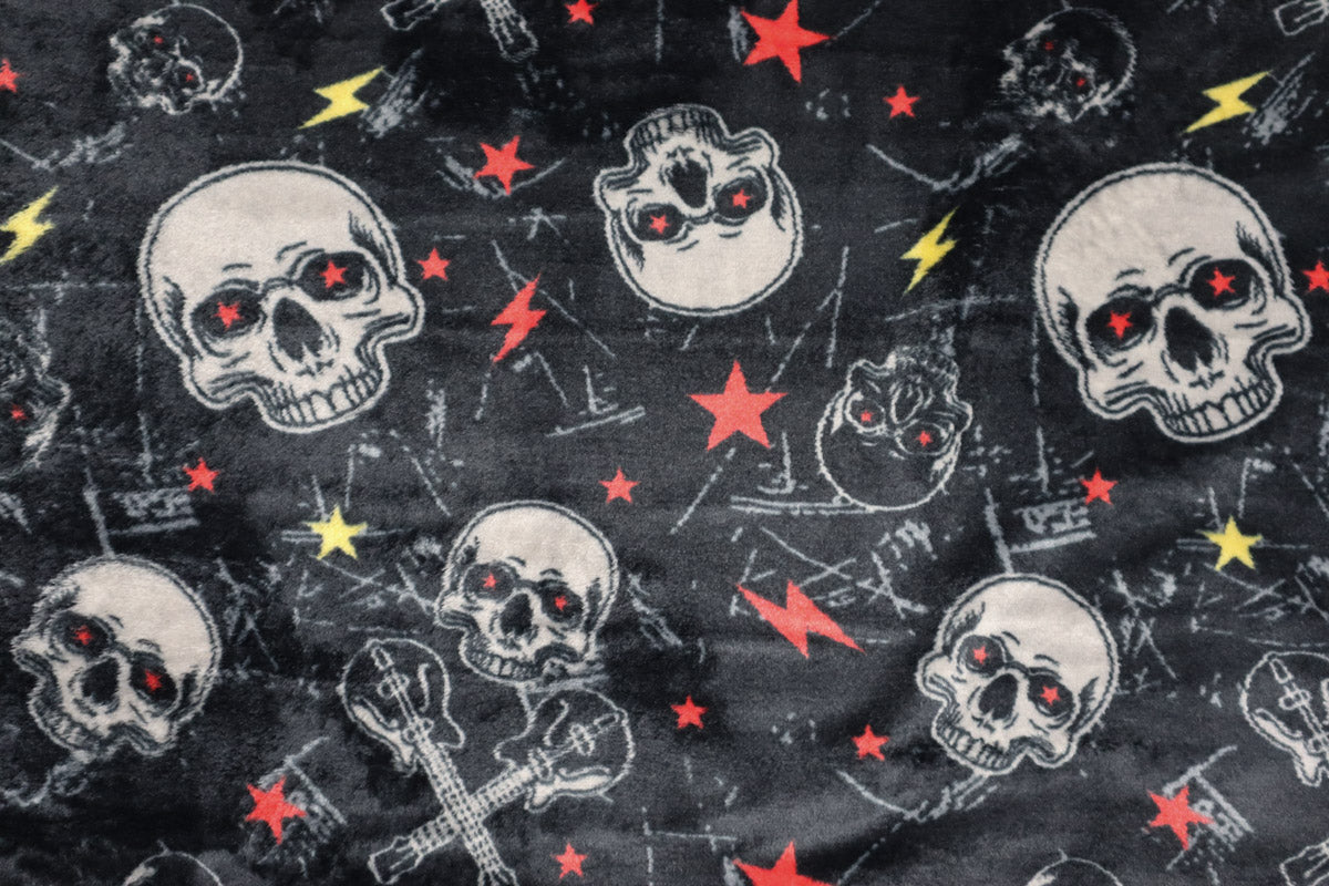 Gruseliger, kuschelig weicher Wellness Fleece mit Totenköpfen und Gitarren.