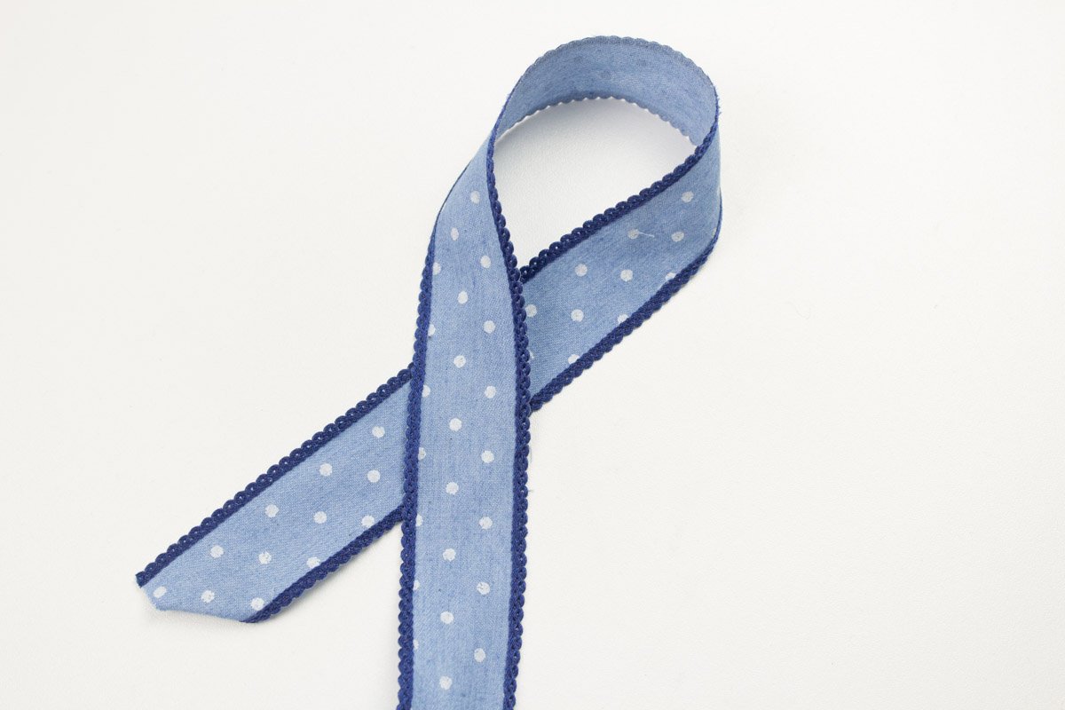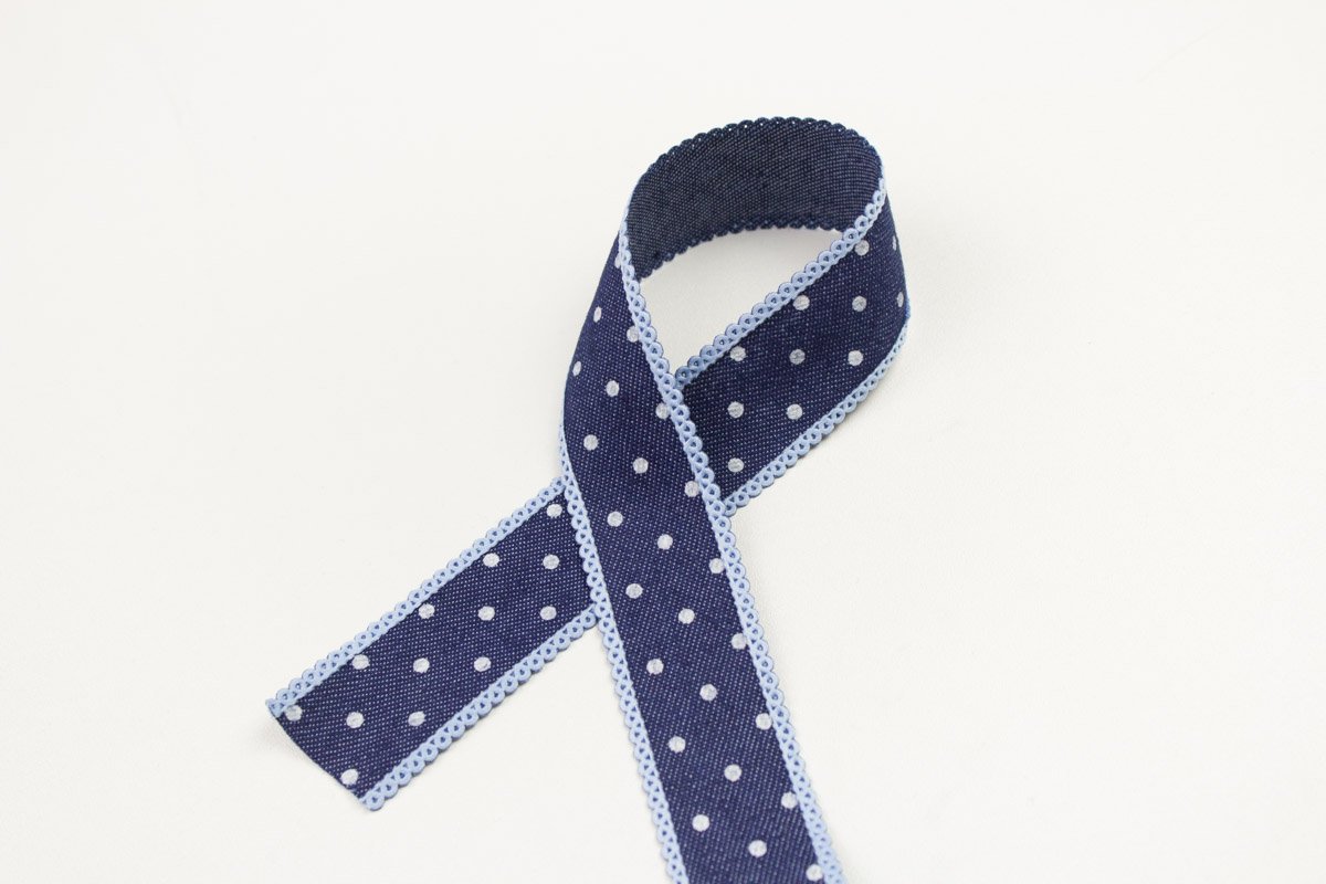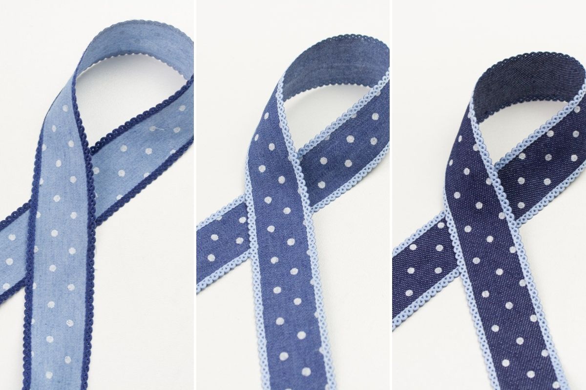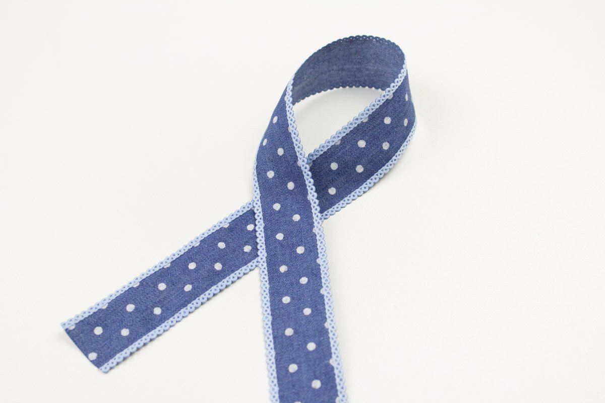 Super schönes Baumwollband in jeansoptik mit kleinen weißen Punkten bedruckt.