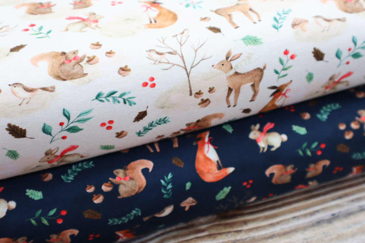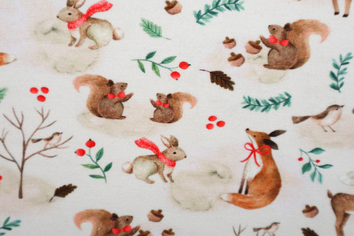 Super süßer Baumwolljersey für Kinder mit süßen Waldtieren, festlich gekleidet mit roten Schleifen, Fliegen oder Schals.
