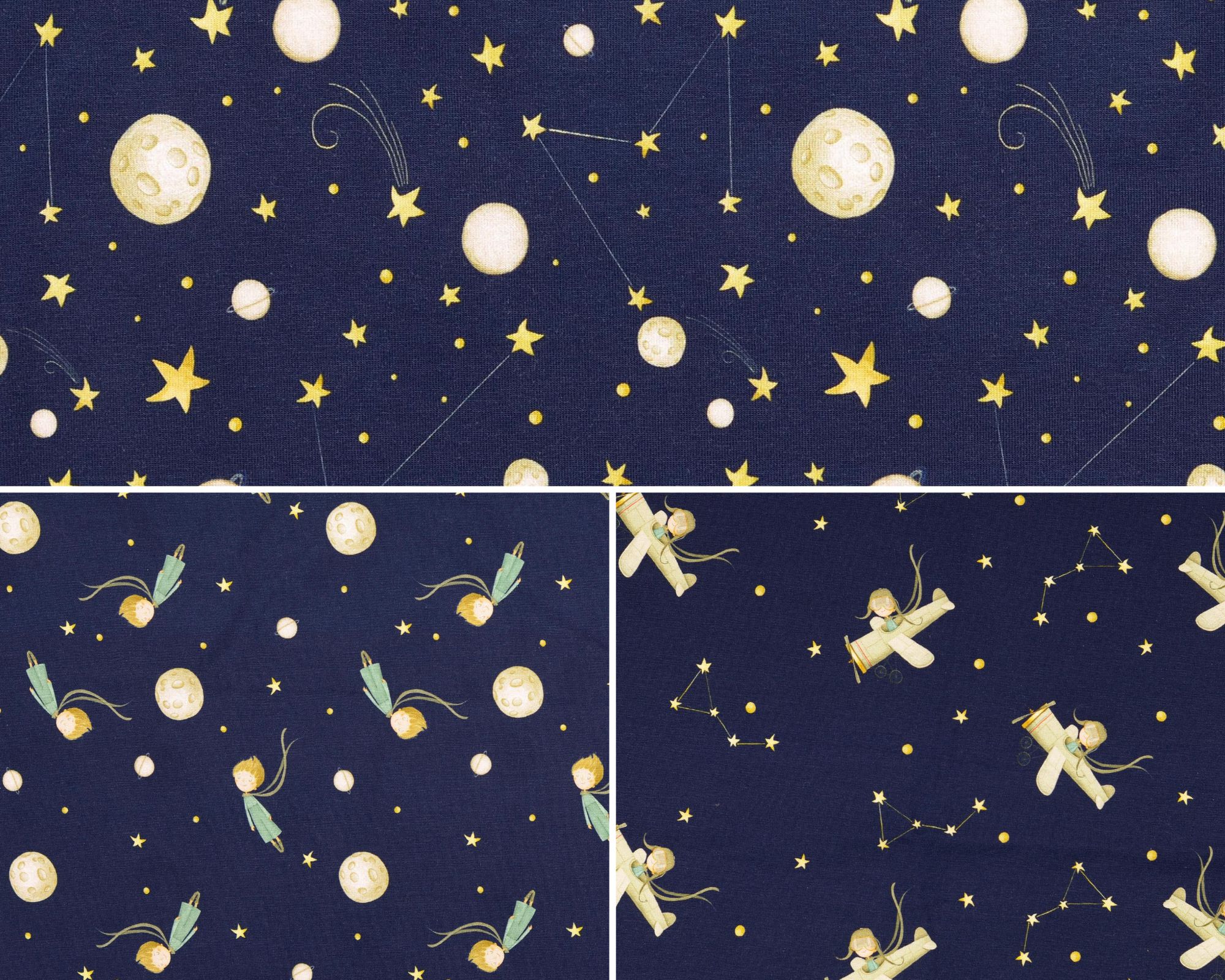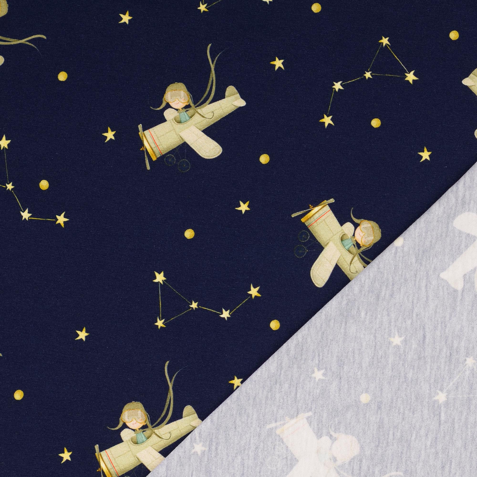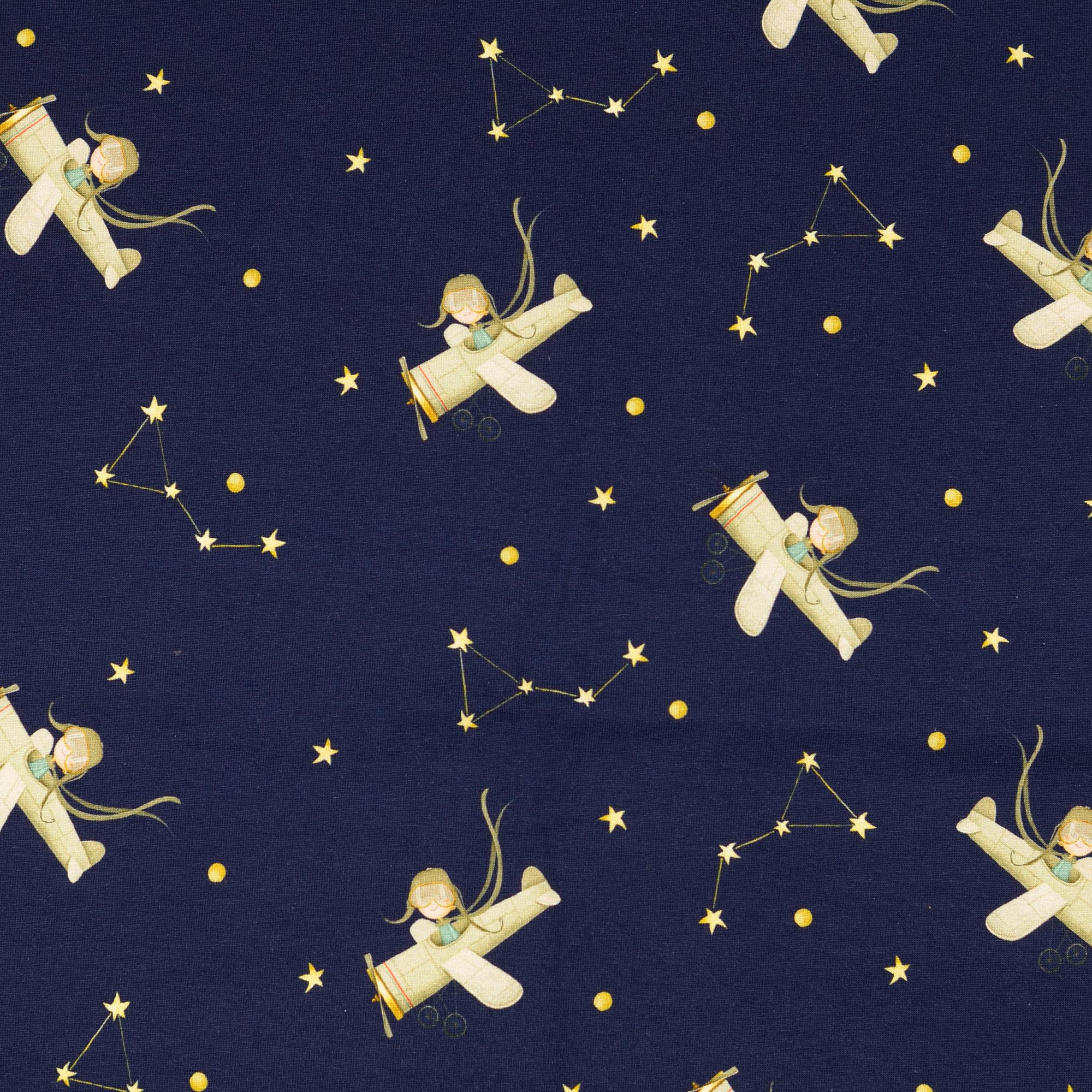 Super schöne Muster mit Planeten, kleinem Träumer im Flieger und Sternenbildern auf dunkelblauem Hintergrund.