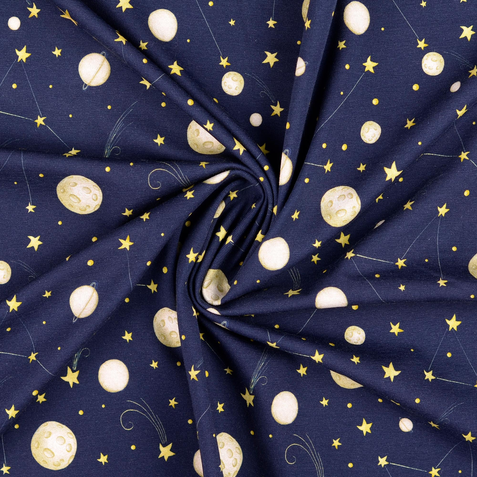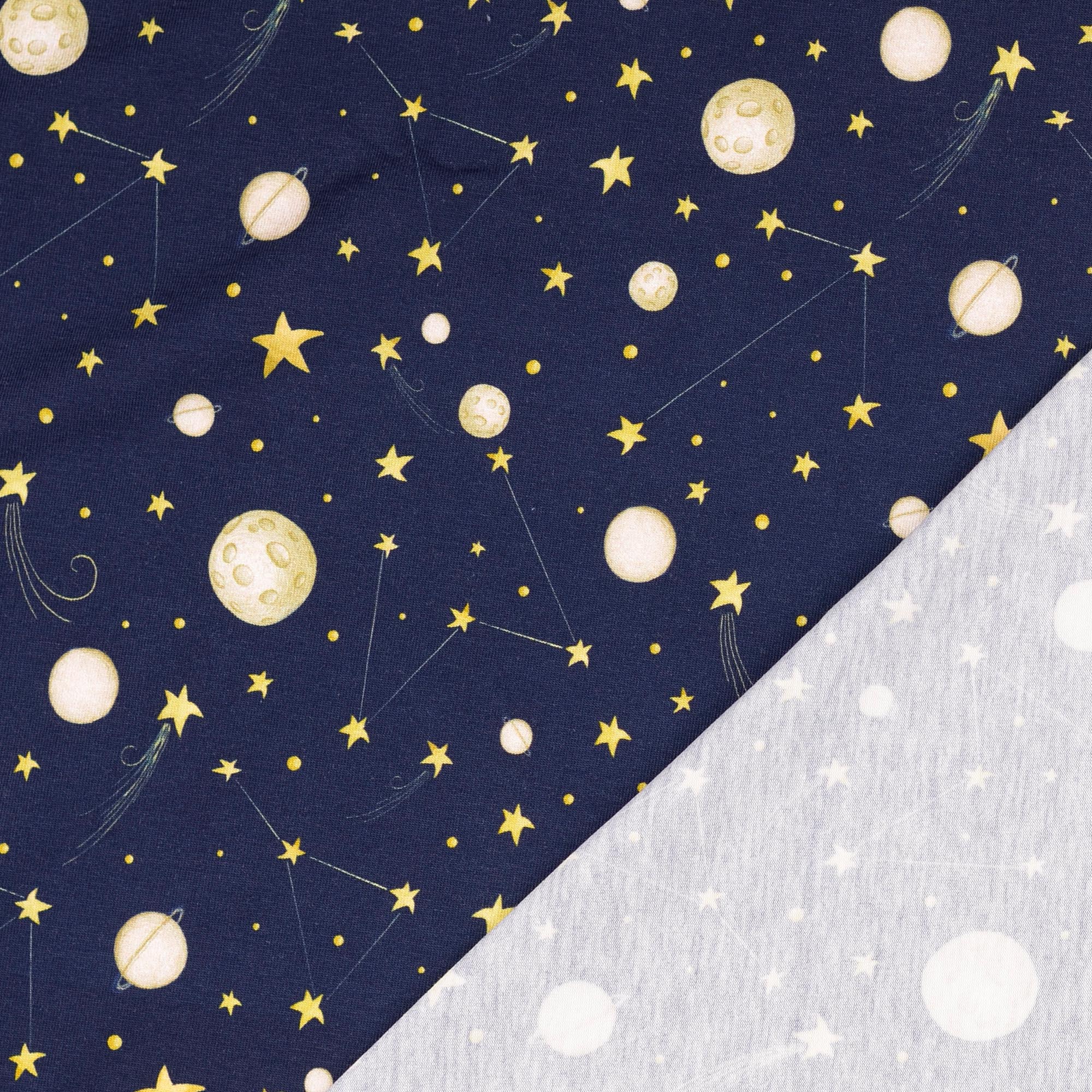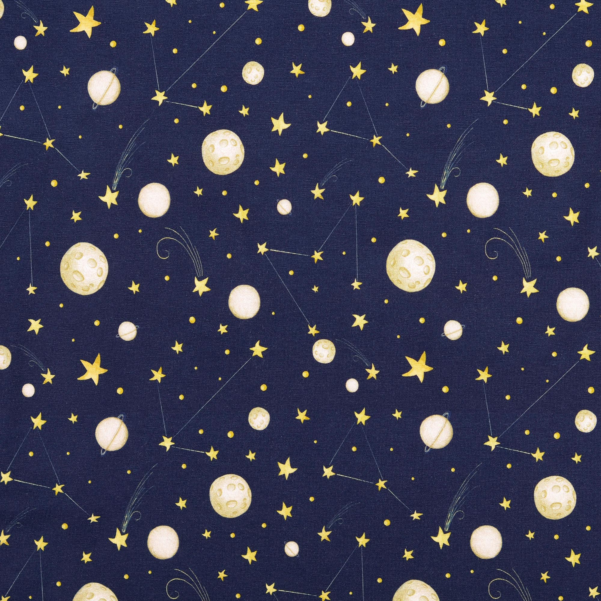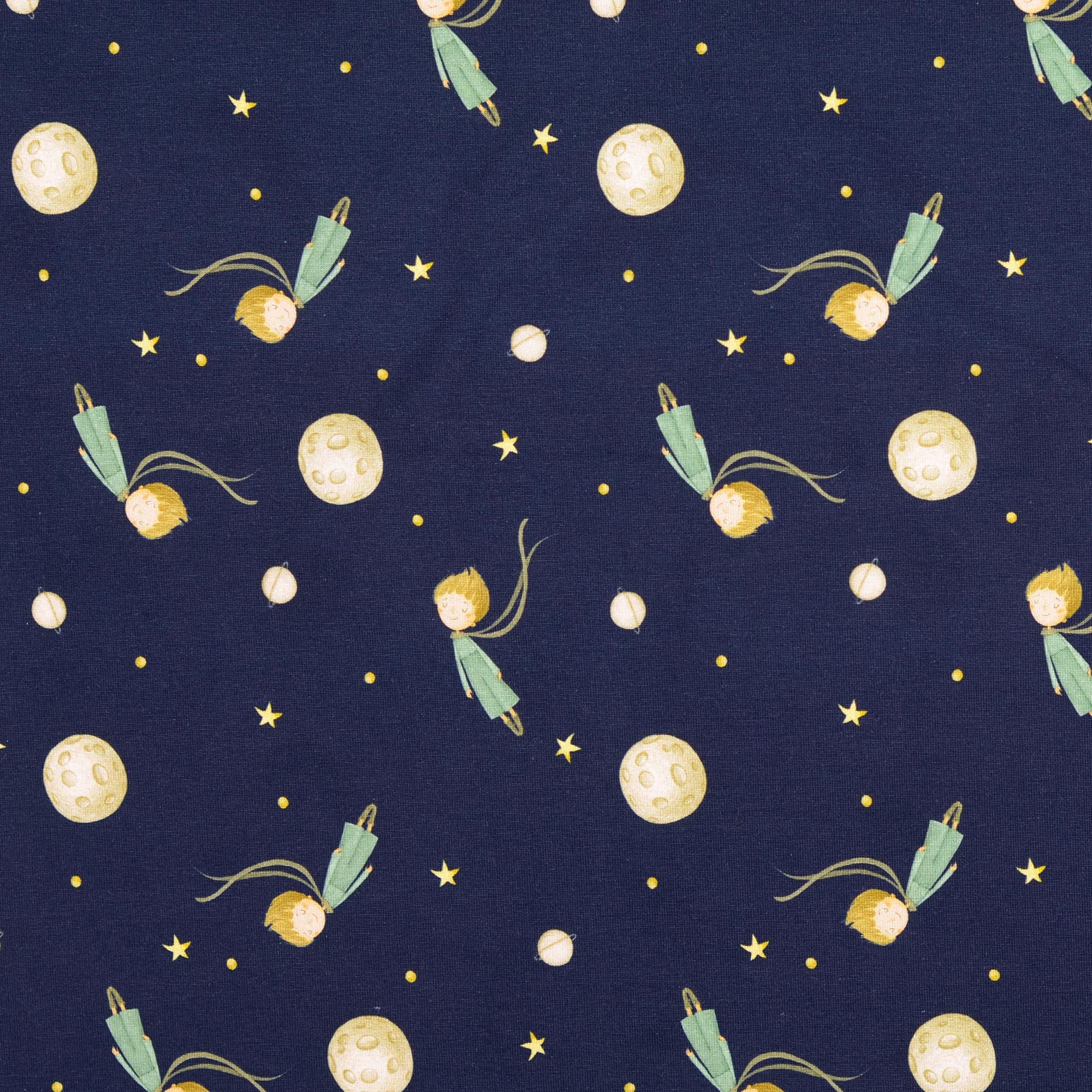 Super schöne Muster mit Planeten, kleinem Träumer im Flieger und Sternenbildern auf dunkelblauem Hintergrund.