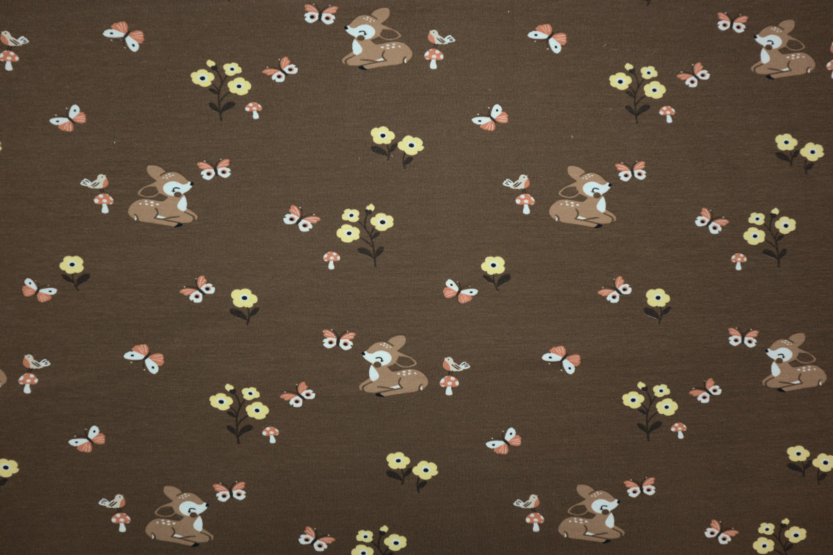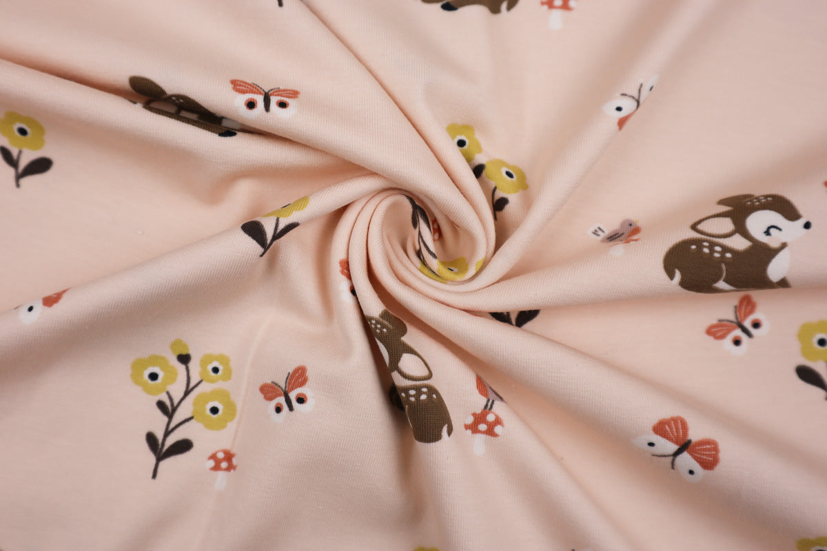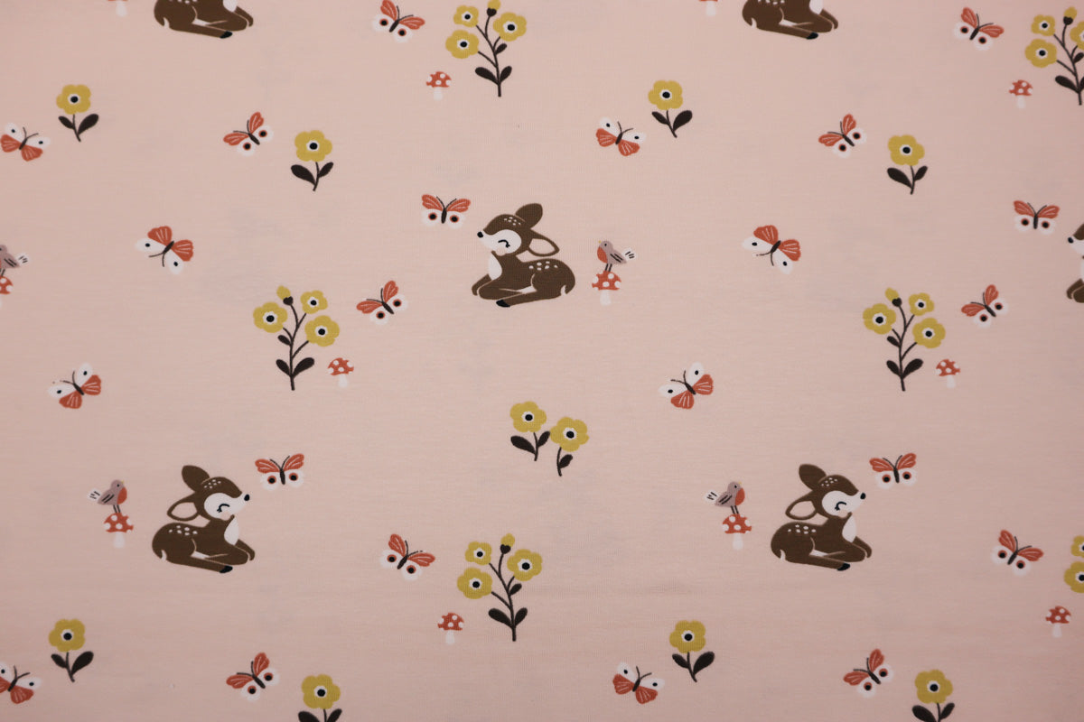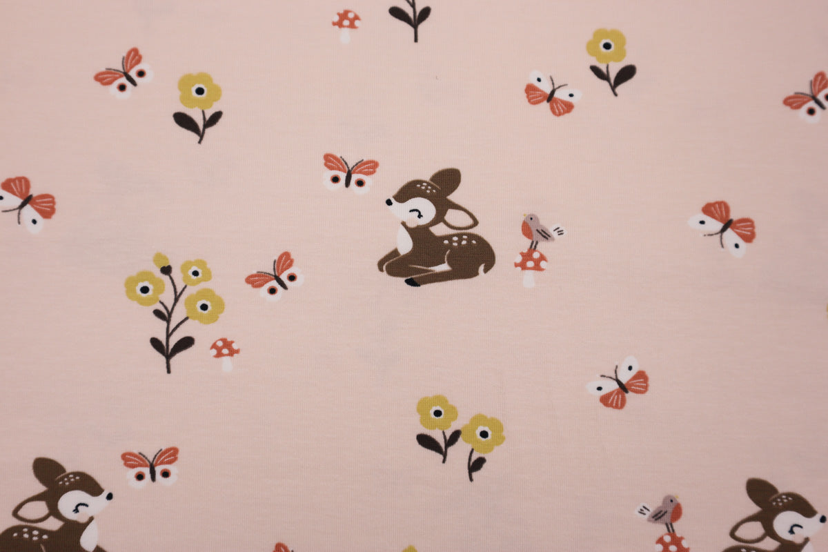 Niedliches Muster mit kleinen Rehkitzen, Schmetterlingen und Blümchen.