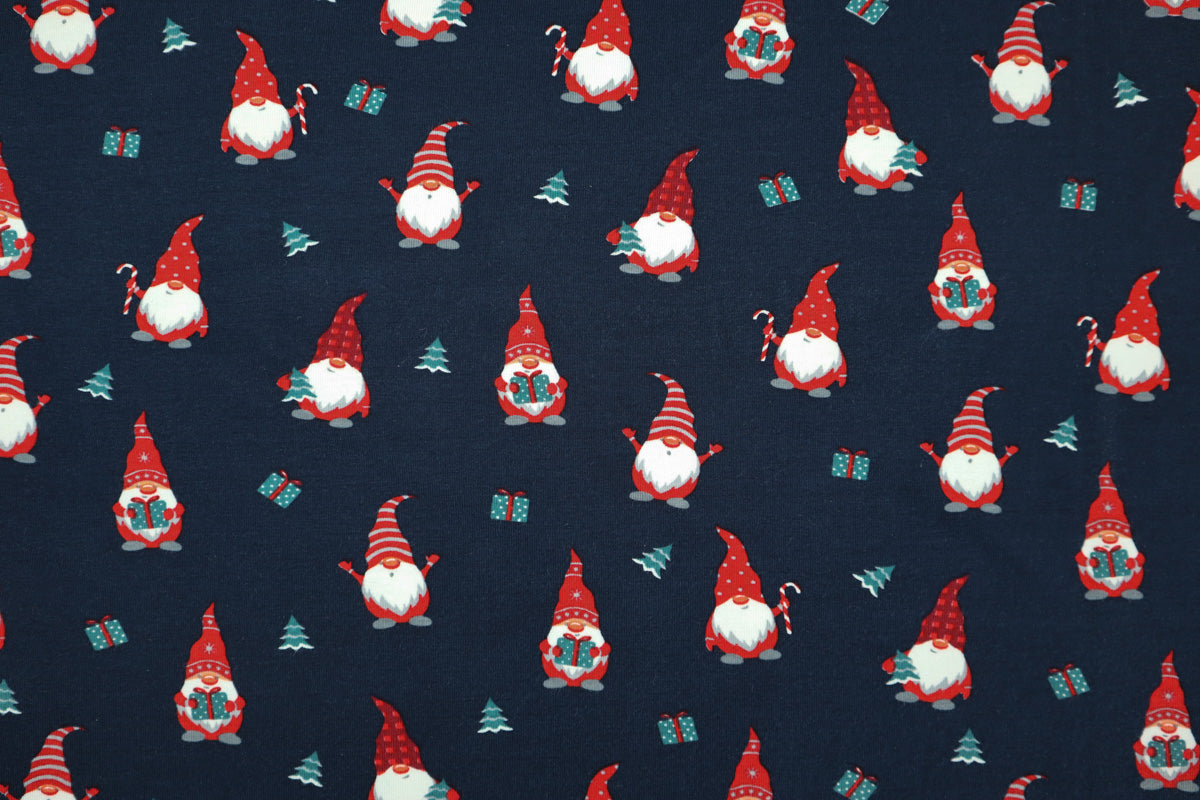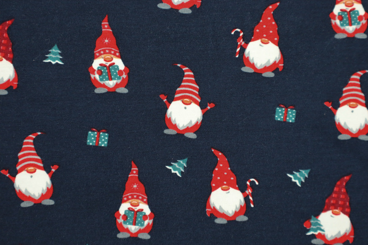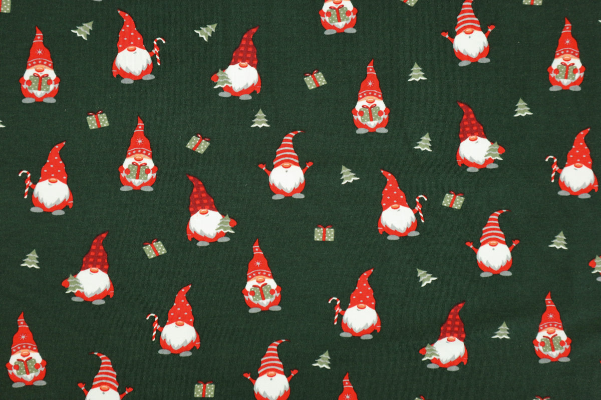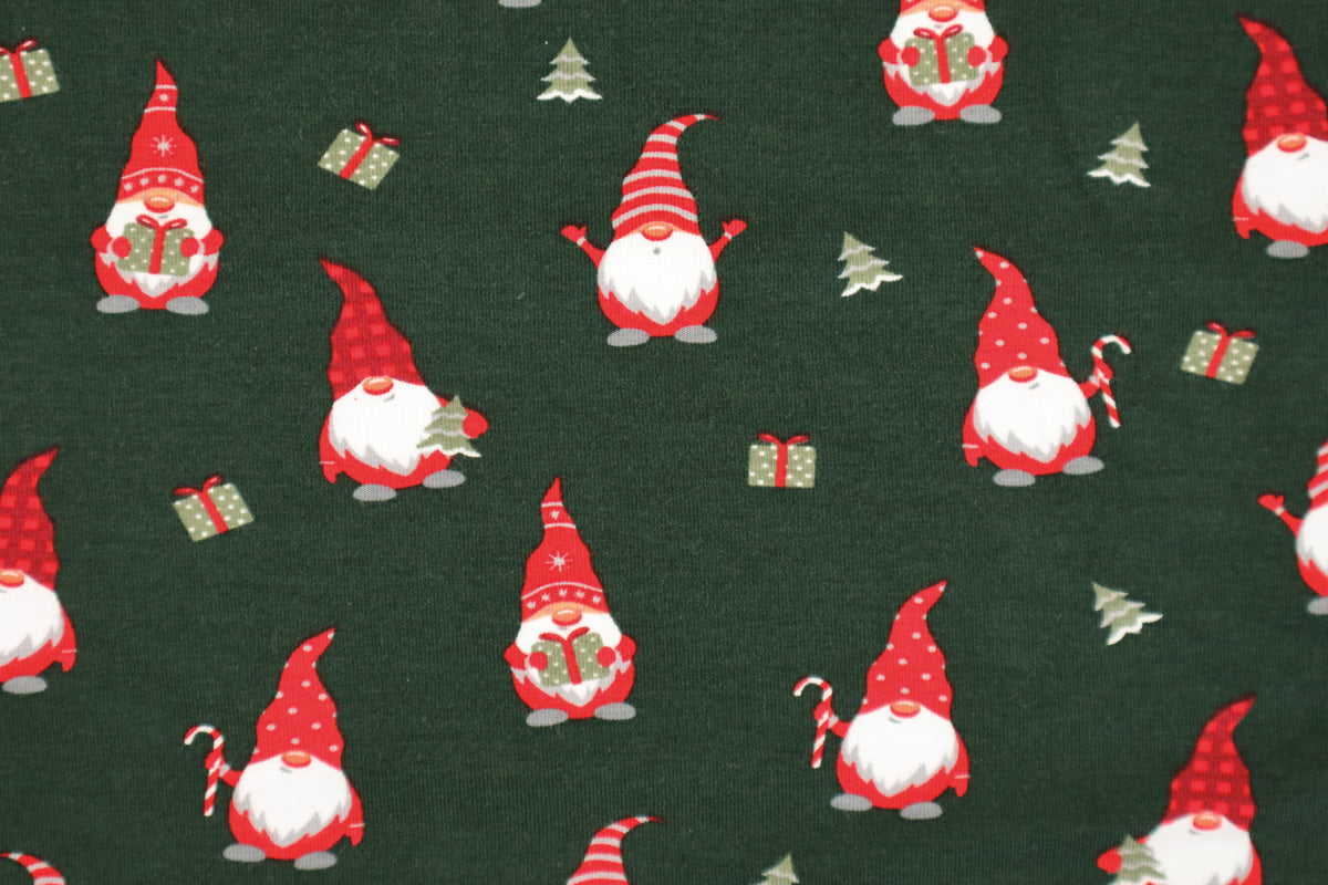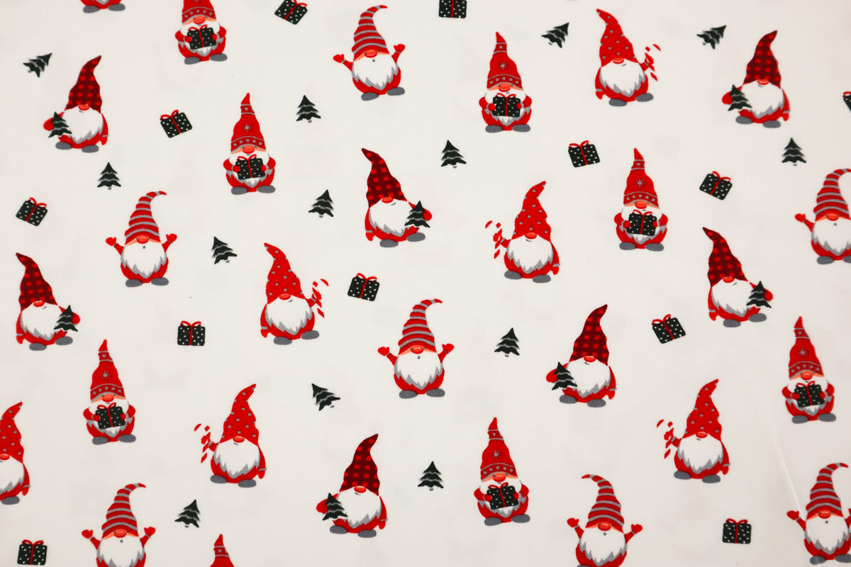 Tolles weihnachtliches Muster mit kleinen Wichteln , Geschenke, Zuckerstangen und Minitannen im Hintergrund.