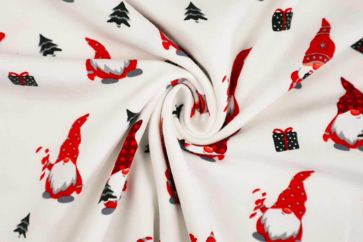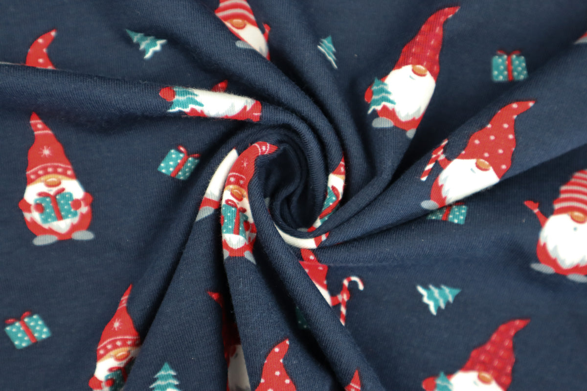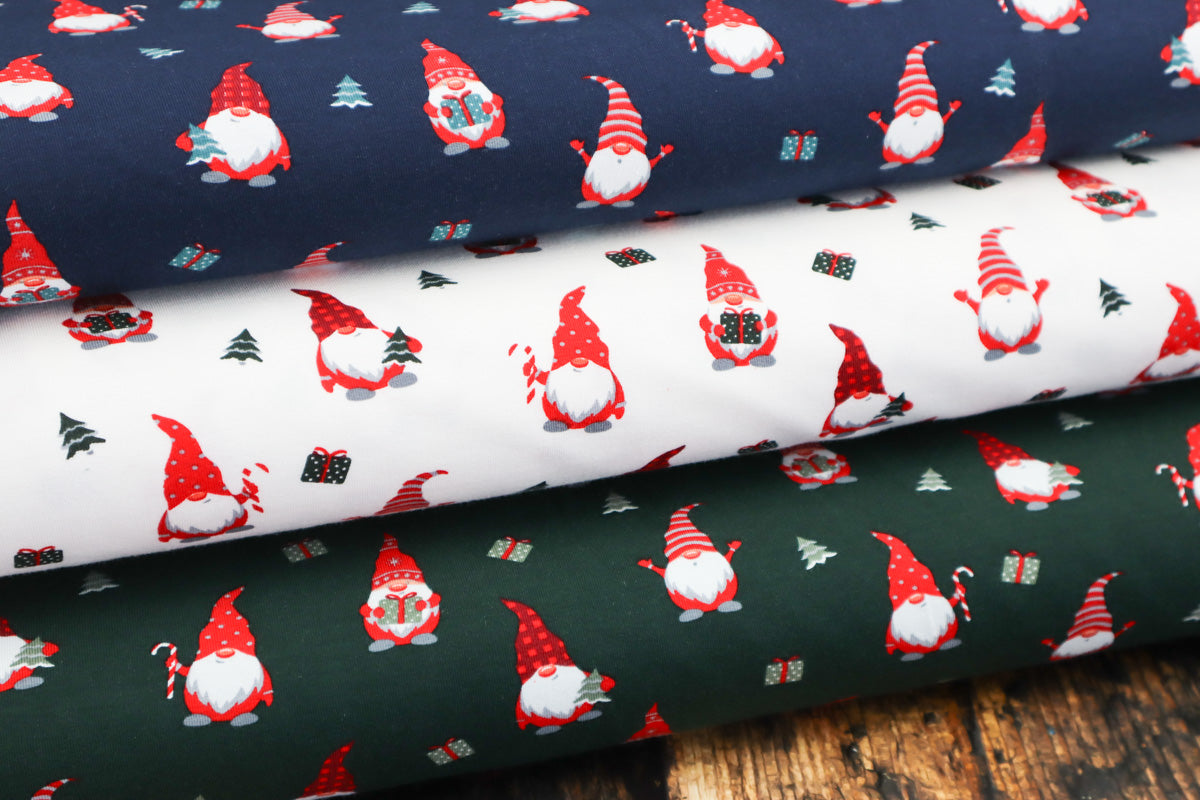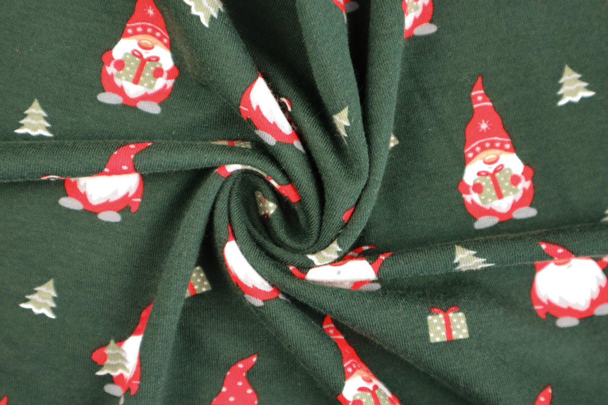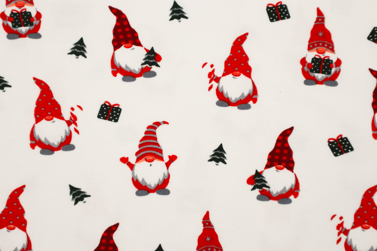 Tolles weihnachtliches Muster mit kleinen Wichteln , Geschenke, Zuckerstangen und Minitannen im Hintergrund.