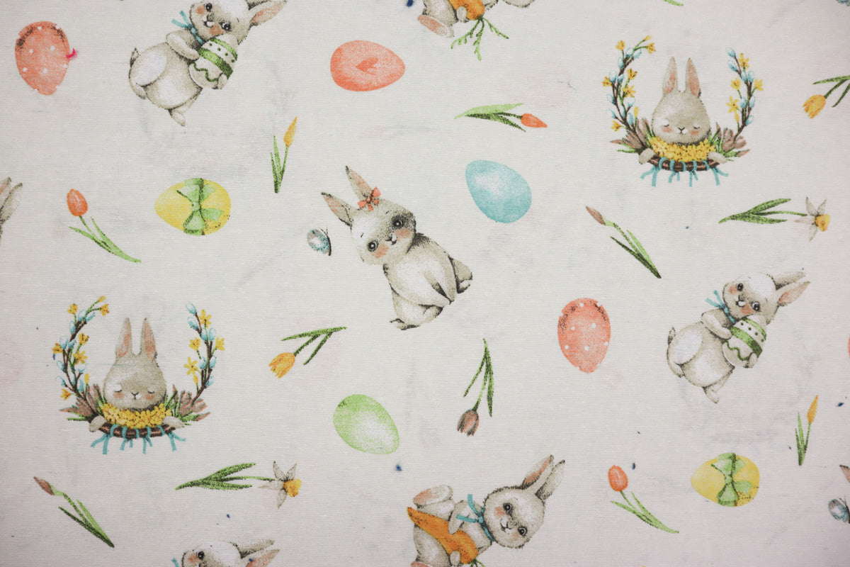 Süßer Dekostoff mit kleinen Häschen , Tulpen und bunten Ostereiern in zarten Farben.