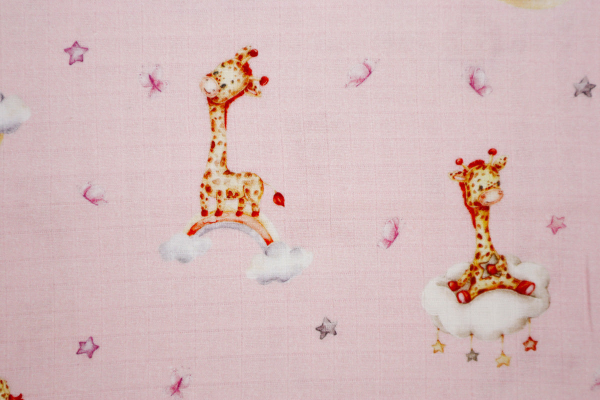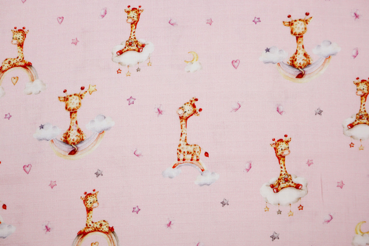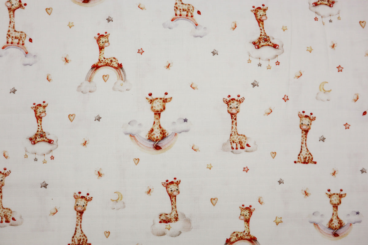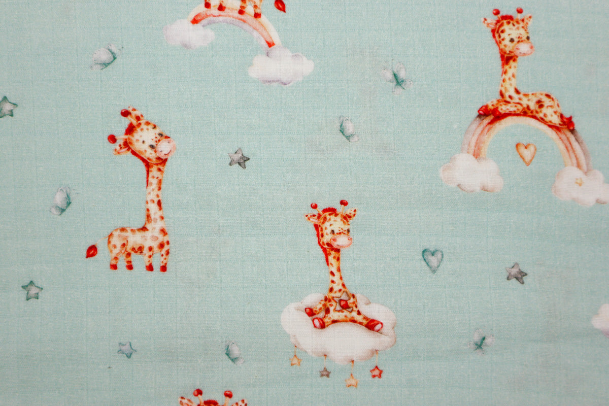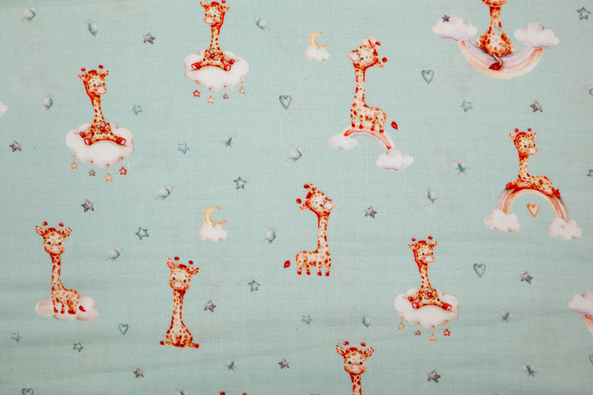 Niedliches Muster mit kleinen Giraffen auf Wolken und Regenbögen umgeben von kleinen Sternchen.