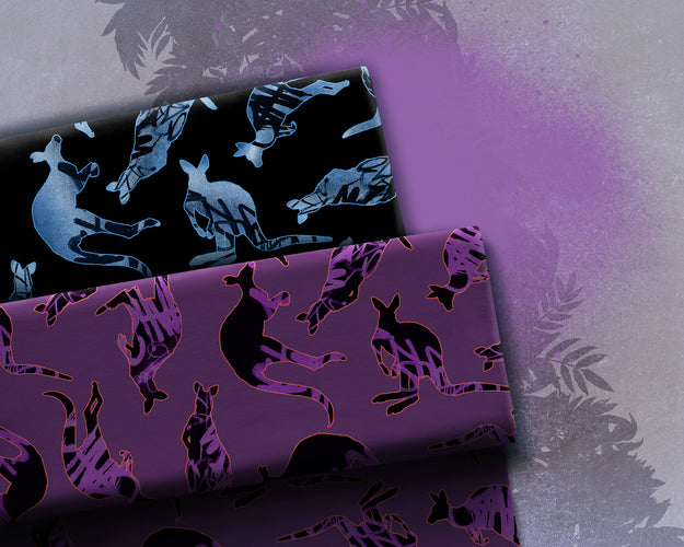 Die Kängurusilhouetten im Graffitistyle und leuchtenden Farben sind kontrastige Farbkleckse zu den einfarbigen Hintergünden und machen das Alloverdesign modern und plakativ.