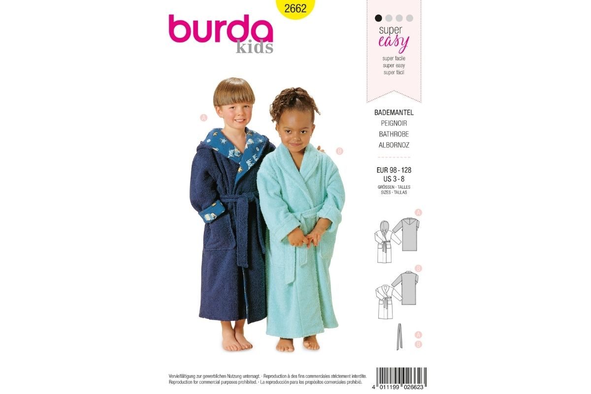 Bademantel, sehr weit. A mit Kapuze, außen Frottee, innen Baumwollstoff. B mit Schalkragen.