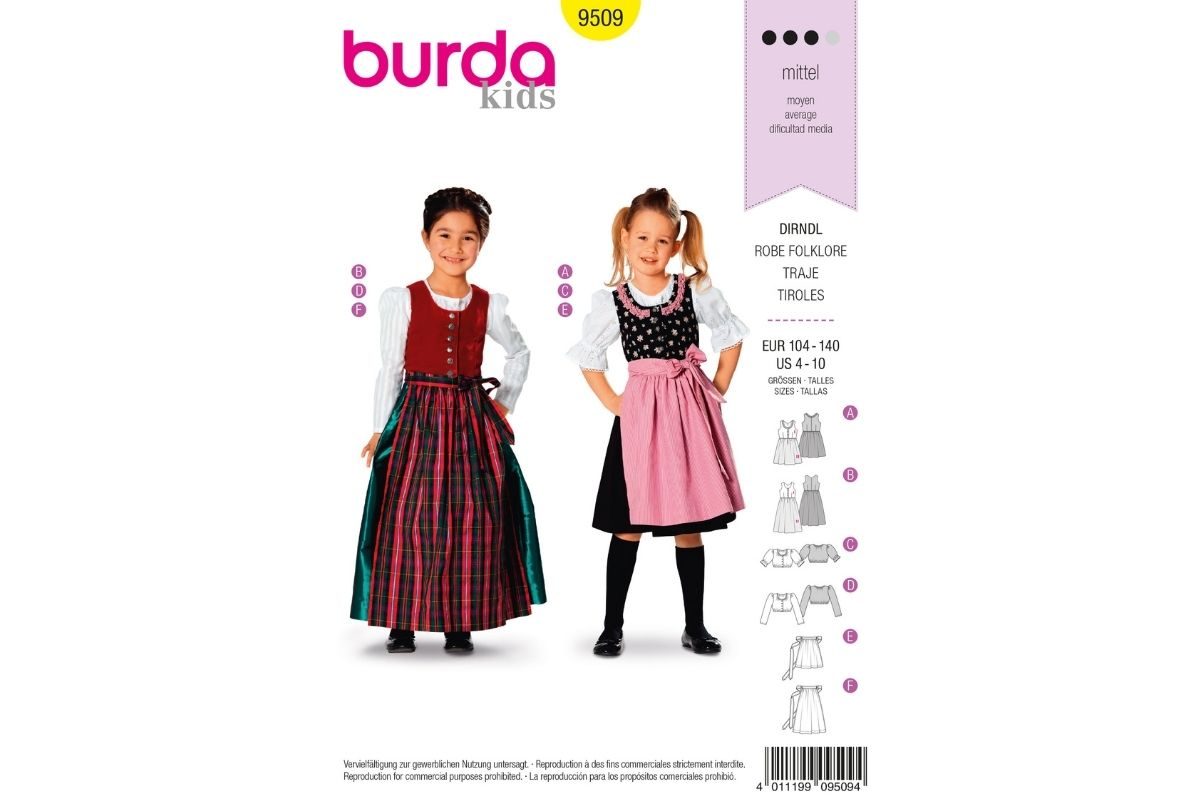 Fesches Dirndl in zwei Längen, kombiniert aus zwei Stoffen mit passenden Schürzen. Das Dirndlblüschen gibt's mit kurzen Puffärmeln oder mit langen schmalen Ärmeln. Stoffempfehlung: ACDE: Baumwollstoffe. B I: Samt. B II, F: Taft, Seide