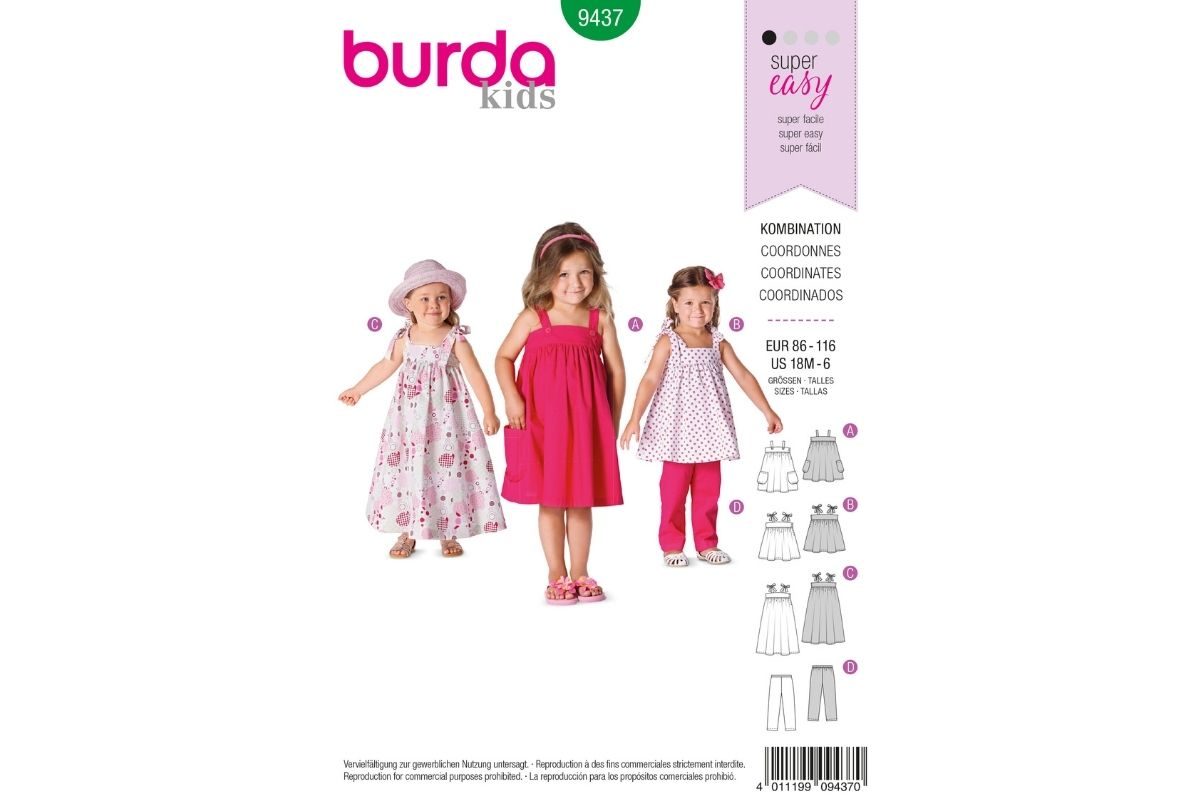 Drei schicke Trägerkleidchen in unterschiedlichen Längen, alle mit Knopfverschluss an der Passe und eingereihtem Rock mit viel Schwung. Bei Kleid A mit dekorativen Taschen sind die Träger zum Festknöpfen. Kleid BC mit Trägern zum Binden. Die einfache Hose D mit Gummizug im rückw. Bund ist schnell in passender Farbe genäht. Stoffempfehlung: Baumwollstoffe