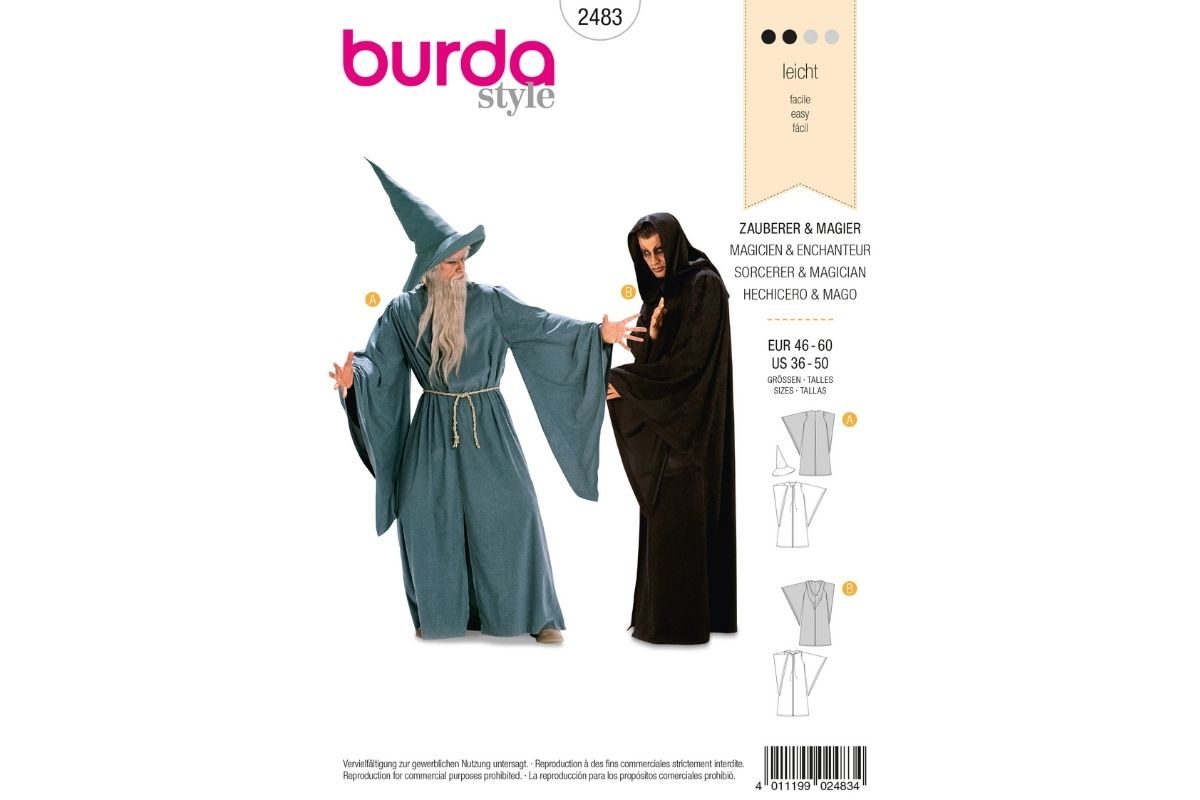 Diese beiden Faschingskostüme oder Halloweenkostüme passen zu klassischen Fantasy-Themen. Hier ein Zauberer oder Hexenmeister. Einmal ein Mantel mit Hut und einmal dafür mit großer Kapuze. Der Mantel hat eine Kellerfalte im Rücken und trompetenförmige Ärmeln.