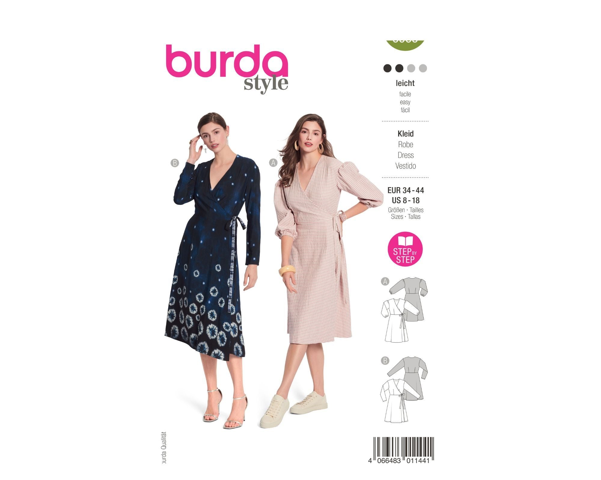 Figurschmeichelnde Wickelkleider für viele Gelegenheiten. Die Rockbahnen sind leicht ausgestellt. Einzig der Ärmel macht den Unterschied: A mit weiten eingereihten, etwas verkürzten Ärmeln. Bei B sind sie lang und schmal geschnitten. Bänder aus demselben Stoff dienen als Verschluss.