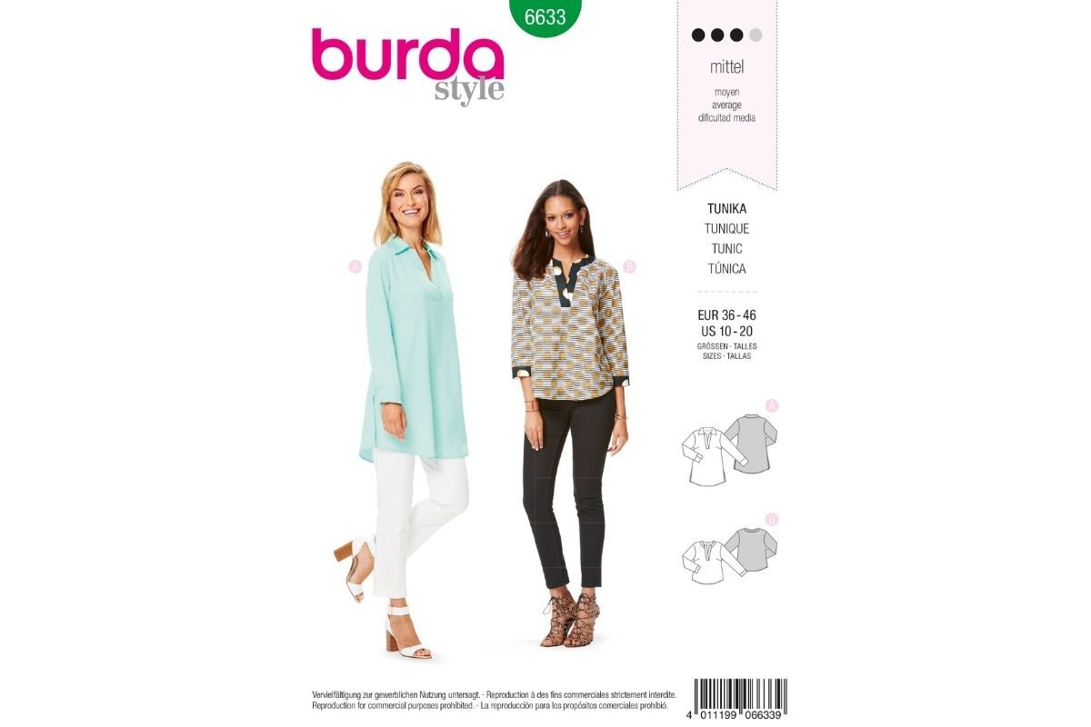 Zu den Lieblingsteilen zählen schon seit längerem Tuniken mit Schmuckelementen. Hier ist es die schräg verlaufende Poloblende, die entweder mit einem Kragen oder mit einer runden Halsblende kombiniert wird. Sie bietet auch Gelegenheit für schöne Farb- und Materialkombinationen.