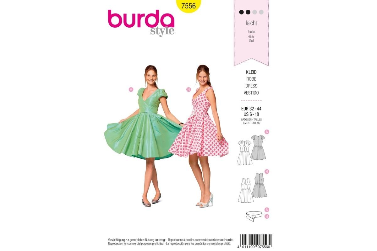 Beschwingter Tellerrock aus den 50ern als Party-Kleid für junge Mädchen. Das figurbetonende Oberteil und der weite, gekräuselte Tellerrock erinnern an den Stil der 1950er Jahre! Wie gemacht für Rock´n Roll, Boogi-Woogi und Jive. Stilecht wird's mit Petticoat darunter! Kleid A hat hübsche kurze Ärmel, gefüttert und mit Gummiband gerafft. Stoffempfehlung: Baumwollstoffe, Leinen, Taft