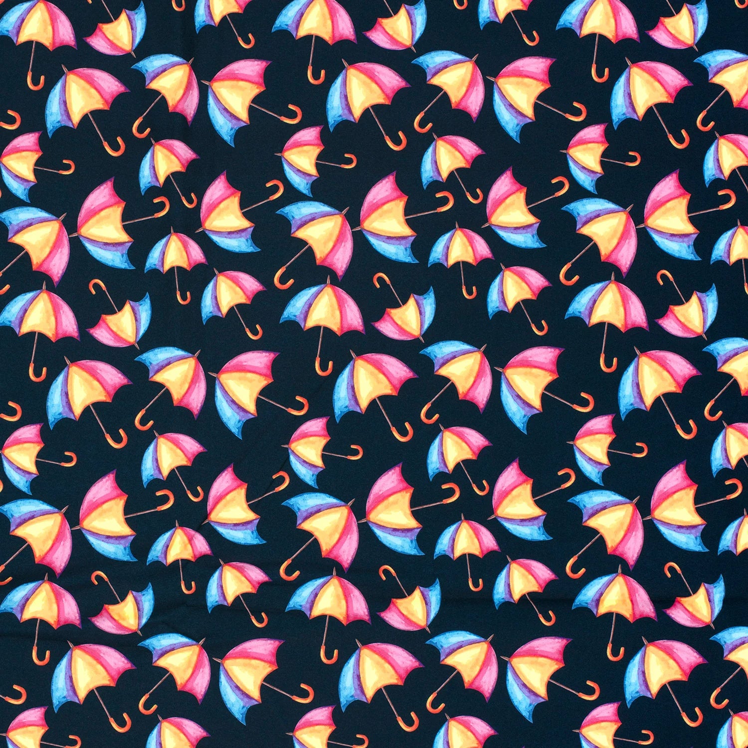 Schönes Muster mit bunten Regenschirmen auf tief dunkelblauem Hintergrund.