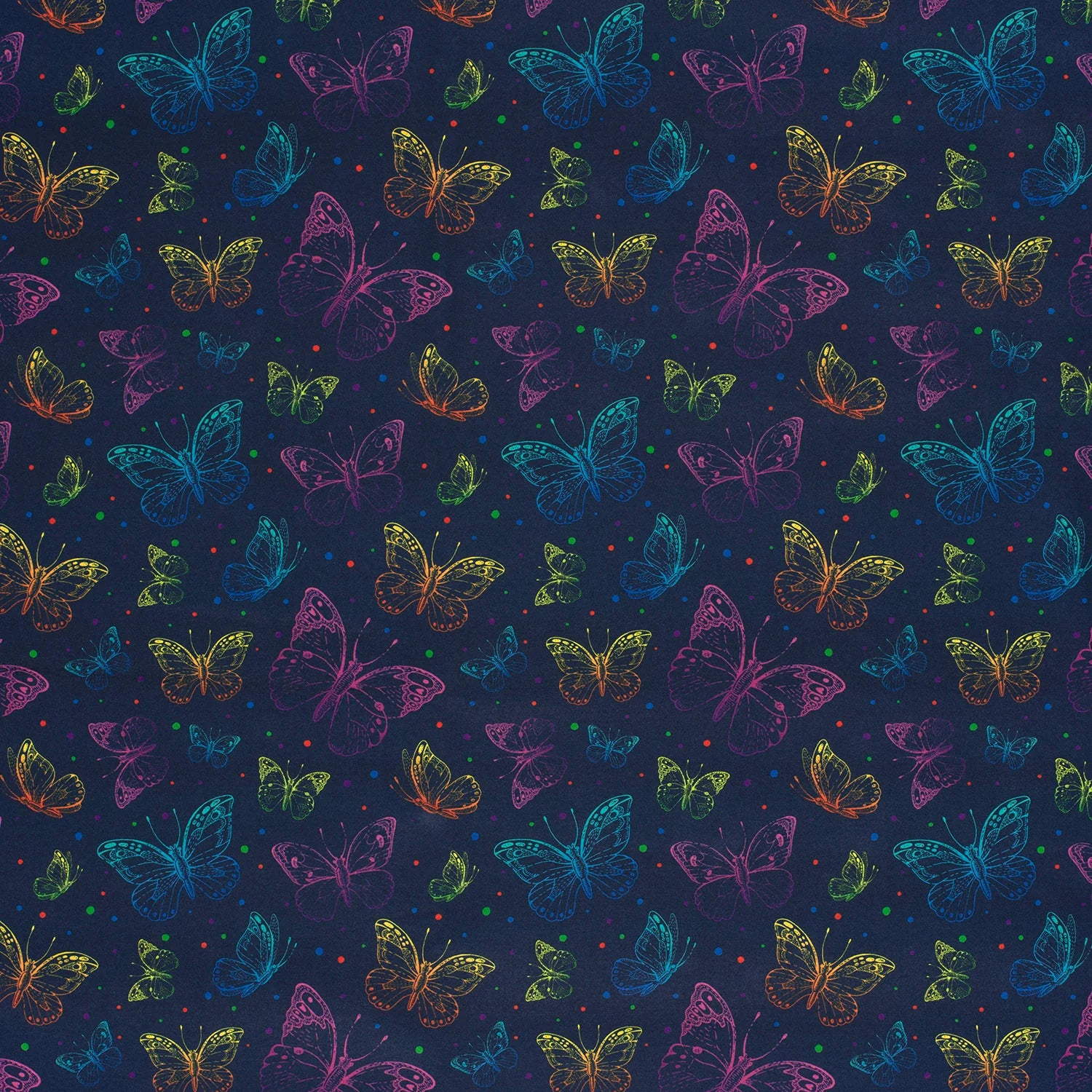 Wunderschönes Muster mit Schmetterlingen ,in unterschiedlichen Größen, und Punkten in Regenbogenfarben auf dunkelblauem Hintergrund.