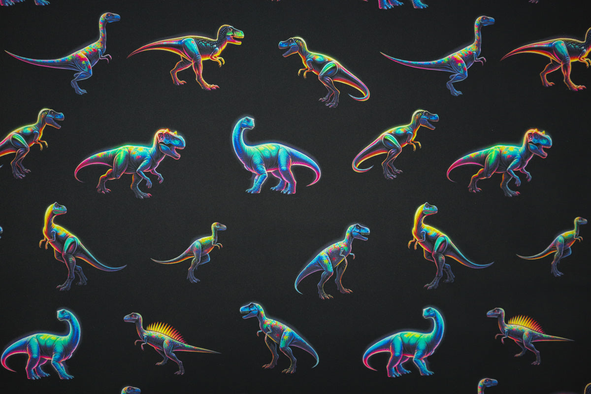 Angesagtes Muster mit bunten Dinos in Neonfarben auf schwarzem Hintergrund.