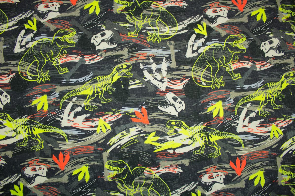 Angesagter Sweatshirtstoff mit richtig coolem Dinosaurier Motive.