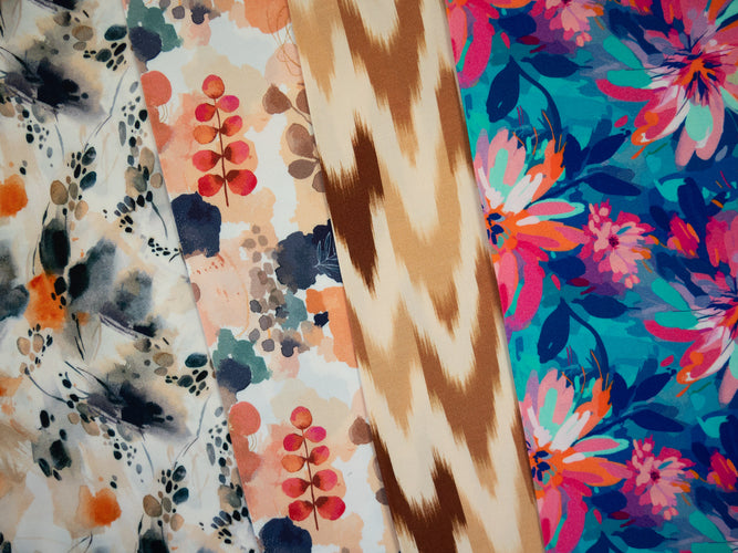 Freut euch auf drei gedecktere Designs, abstrakte und florale Designs auf Beige und Apricot sowie das trendige, unregelmäßige Chevron-Muster in Natur/Beige/Braun-Tönen.